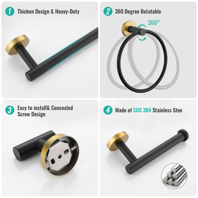 Black and Gold Towel Bar Set 6 Pieces Bathroom Hardware Accessories Set Include 19.68/23.6 in Towel Bar Towel Ring Towel Hook and Toilet Paper Holder Stainless Steel Wall Mounted