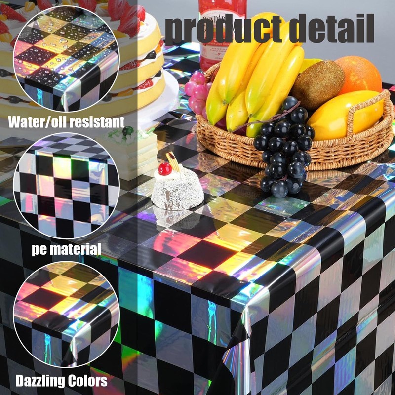 - Elegant design with vibrant colors: Featuring a diamond checkered pattern with a shiny holographic rainbow background, these tablecloths shimmer beautifully under different lighting: Our colorful party decorations are sure to add a bright, stylish touch to your celebrations and wow your guests.