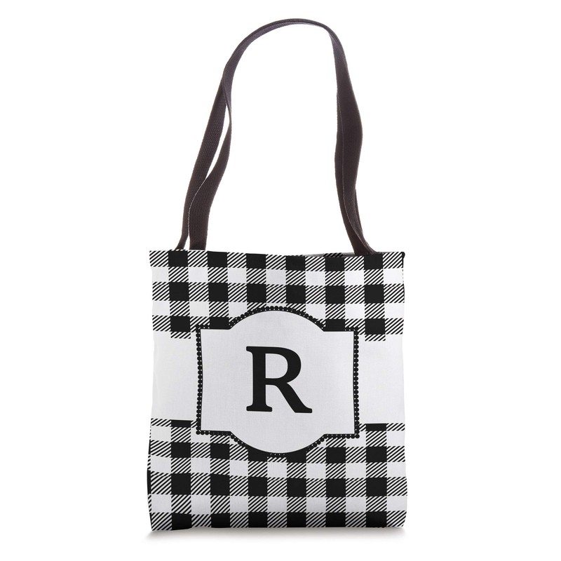 Black and White Buffalo Plaid Monogram Letter R Initial Gift Tote Bag