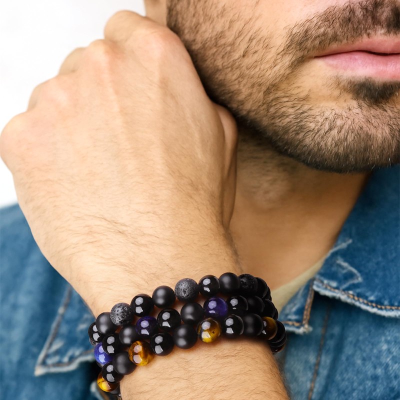 - ✦Stylish Bracelet Set✦ This 3Pcs jewelry set includes a 8mm tiger eyes bracelet, a 8mm black onyx bracelet and a 8mm blue tiger eye bracelet with triple protection, creating a stylish and versatile look that's perfect for both men and women