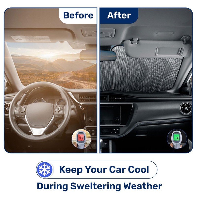 • HIGH-QUALITY MATERIAL: Our sturdy car shade front windshield is constructed from high-quality double-insulated laminate. The accordion-type windshield shade is made of reflective aluminum foil that protects you harmful UV rays effectively.