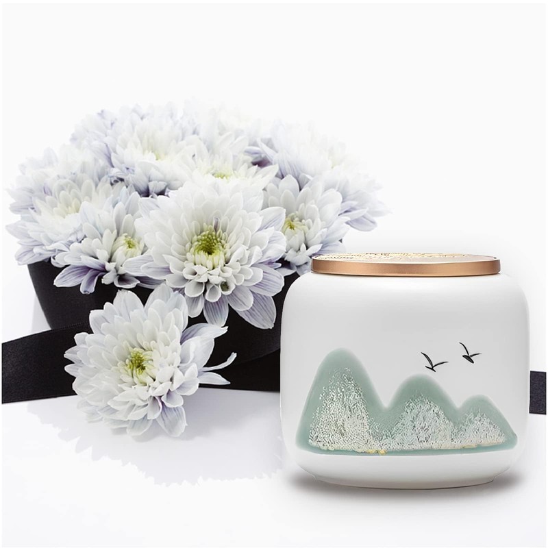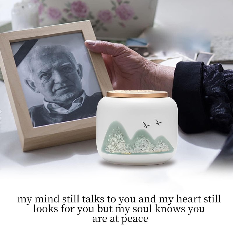 • 🌟 Timeless Design: Crafted from ceramic materials with a hand-kiln glaze and adorned with a serene mountain motif, this urn embodies enduring craftsmanship and reflects the love shared.