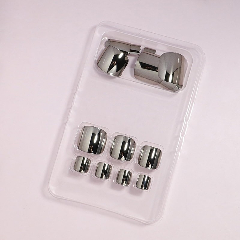 Black Chrome Press on Toenails, Metallic Fake Toe Nails for Women, Short Square Toe Nails Reusable Artificial Fake Nails Glossy Toenail Press on Nails Pedicure Kits 24 Pcs