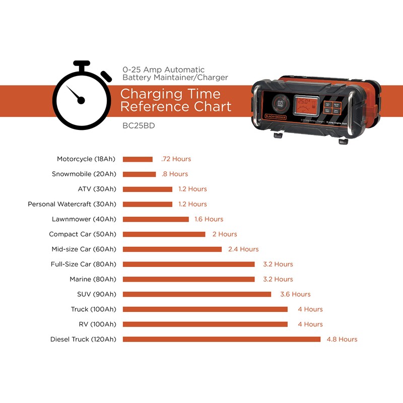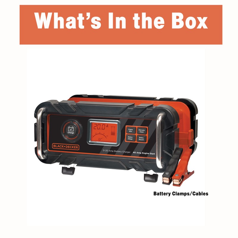 The BLACK+DECKER BC25BD battery charger and maintainer will get you back on the road in minutes when your vehicle won't start or if your battery needs maintenance. Just connect the battery charger clamps to the battery terminal and press charge. The bench battery charger automatically does the rest for optimum performance. Fully automatic high frequency charging delivers 3 stage charging, automatically switching from fast charge, to top-off, to trickle charge. This bench battery charger is ideal for motorhomes, boats, jet skis, lawn tractors, ATVs, snowmobiles, and vehicles that sit idle for months at a time. Charge and maintain any AGM, GEL, or WET automotive or marine 12 V battery. It's equipped with a digital LCD screen that displays charging status and battery status with easy to understand icons. It also features an alternator check to evaluate the battery voltage under load to indicate if the alternator is maintaining battery level. This battery charger eliminates the need to manually input settings like battery type and size, and charges up to 40 percent faster than other conventional chargers. The BLACK+DECKER BC25BD bench battery charger and maintainer also features a 75 amp engine start, which helps start your vehicle in about 90 seconds for when you need to get back on the road quickly. The built-in cord, cable wrap, and clamp storage make this battery charger easy to use and store. California Energy Commission (CEC) compliant and ETL Certified for performance and safety. Includes a limited 1 year manufacturer warranty.