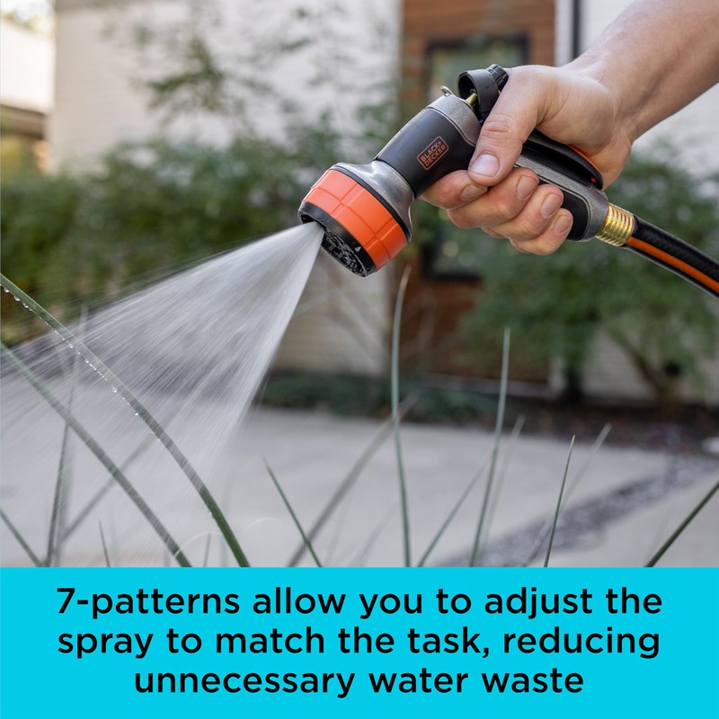 Take on any outdoor watering task with the Black + Decker? Dial 7 Pattern Hose Nozzle, built for power, comfort, and reliability. Featuring a rugged cast metal construction, this heavy-duty nozzle withstands everyday wear while offering a secure, rubberized grip that stays firm in wet conditions. Easily cycle through 7 spray patternsfrom a focused jet to a soft mistto tackle everything from garden beds to patio cleanup. The locking rear trigger and continuous flow handle lock provide hands-free operation for longer watering sessions without fatigue. Built tough for daily use, this nozzle delivers dependable performance and all-day comfort for every season.