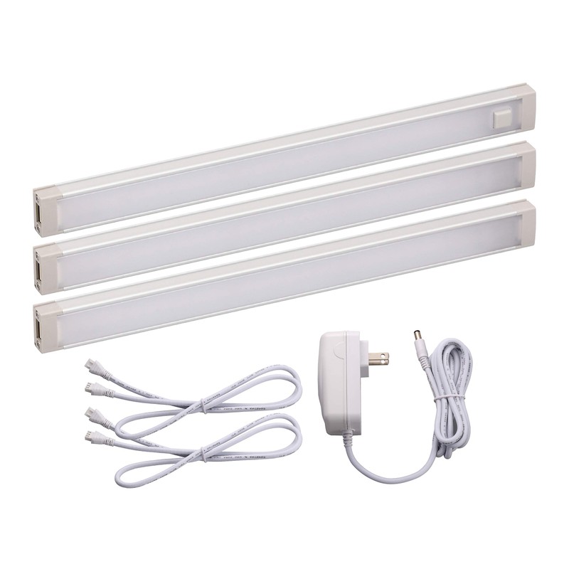 Engineered for superior performance, our revolutionary line of PureOptics LED Under Cabinet Lighting is powerful, sleek, and a snap to install. With its slim shape, the LED lighting emits a warm, rich accent lighting with an expanded light zone, while the unit remains hidden for clean, contemporary style. Great for areas large or small, easily link up to 5 light bars (3 included) with each bar illuminating spaces up to 36 inches wide. Conveniently included in the kit are various sized jumper wires, which provide additional flexibility to cover longer distances or specialty configurations, such as jumping a stove. Depending on the task at hand, customize the light brightness by switching through the light’s 10 dimmer settings to find the perfect level of illumination while the flicker-free light softly fades out without any hot- spots. In addition to the power switch on one of the lights, for convenience and speed, you can also wave your hand below the motion sensor to turn the lights on or off. For energy efficiency, activate the timer and after three hours, the lights automatically shut off. With cost-efficient LEDs, use 85% less energy for brilliant illumination lasting 50,000 hours. Conserve energy with crisp, warm white light that is high-contrast for vivid, brilliant colors, so you can work, play, and create with unparalleled clarity. APPLICATION: To apply, simply adhere mounting clips to the light bar, attach to desired location, and plug in. For a more permanent solution, use the screws in the kit. For specialty configurations, the various-sized jumper wires (included) provided additional flexibility. DETAILS: Simple tool-free installation with adhesive mounting clips, or a permanent application using screws Choose between the motion sensor for hands-free on and off, or the power button for traditional use Slim design (0.4” height by 0.75” width) allow lights to be easily hidden 10 dimmer settings Optional auto timer shuts off after three hours to save energy Warm white light that is crisp and high-contrast for vivid, brilliant colors 50,000 hour life and uses 85% less energy 3-Year Limited Warranty SPECIFICATIONS: Bulb Length: 9” Voltage: 24V Color Rendering Index (CRI): 82.0 Color temperature (in Kelvin): 2,700K Lumens per Bar: 360 Efficacy: 72.0 Total Watts: 15.0 Maximum Cabinet Size Per Light Bar: 36” Energy Star Approved KIT CONTENTS: 9-inch LED light bar with power button 9-inch LED light bar (2x) Control Box AC Adapter Light bar mounting clips (10x) Wire mounting clips (12x) Jumper extender 4-inch jumper wires (3x) 12-inch jumper wire 30-inch jumper wires (2x) Optional - Mounting screws (6x)