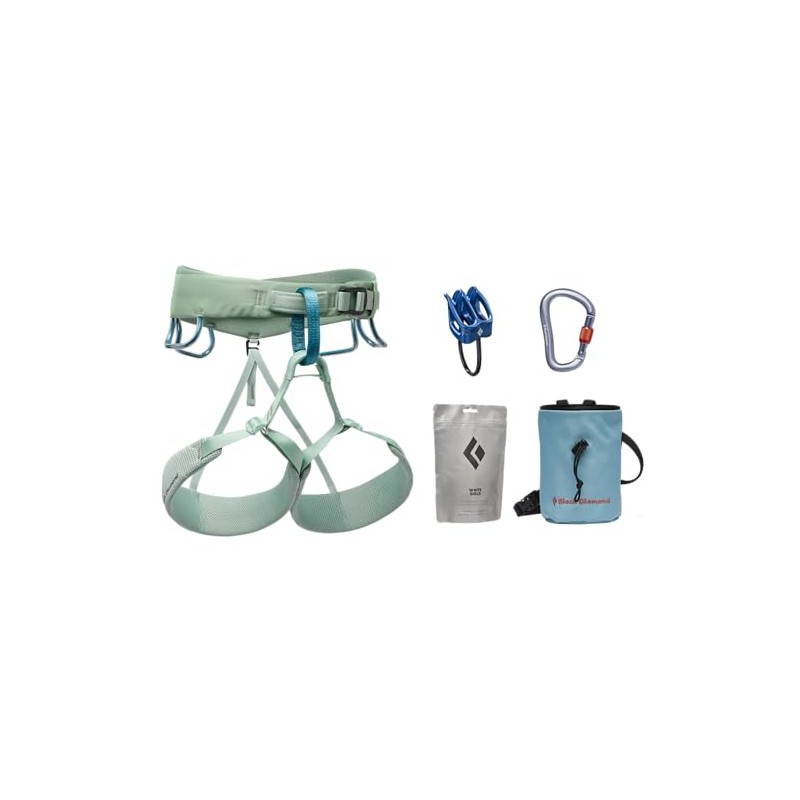 • A complete climbing harness package with Black Diamonds Momentum harness, ATC-XP fuse/rappelling device, RockLock Screwgate Carabiner, Mojo Chalk Bag (Random Color) and Refillable White Gold Chalk Shot in a mesh zippered carry case