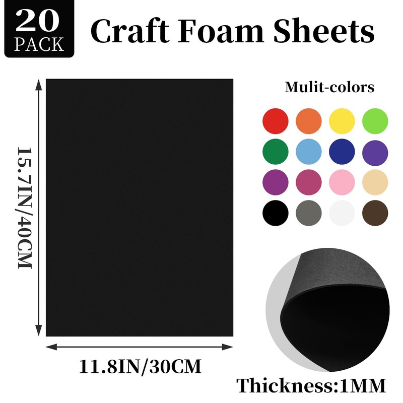 Black EVA Foam Sheets, 16 x 12 Inch, 20 PCS, 1mm Thick Craft Foam Paper for School Projects and Scrapbooking DIY Handcraft