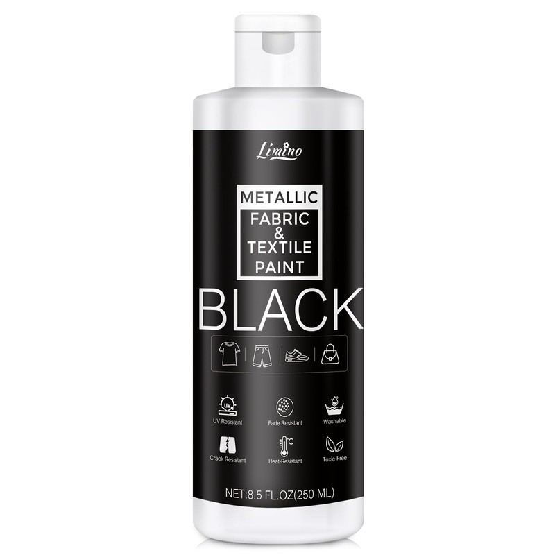 - FABRIC PAINT BLACK - Breathe new life into your favorite fabrics with our premium Black Fabric Paint! This 8.5 fl.oz (250ml) bottle lets you easily add vibrant designs, lettering, and patterns to clothing, canvas, leather, and beyond. Transform your items without changing their texture, keeping your wardrobe fresh and exciting.