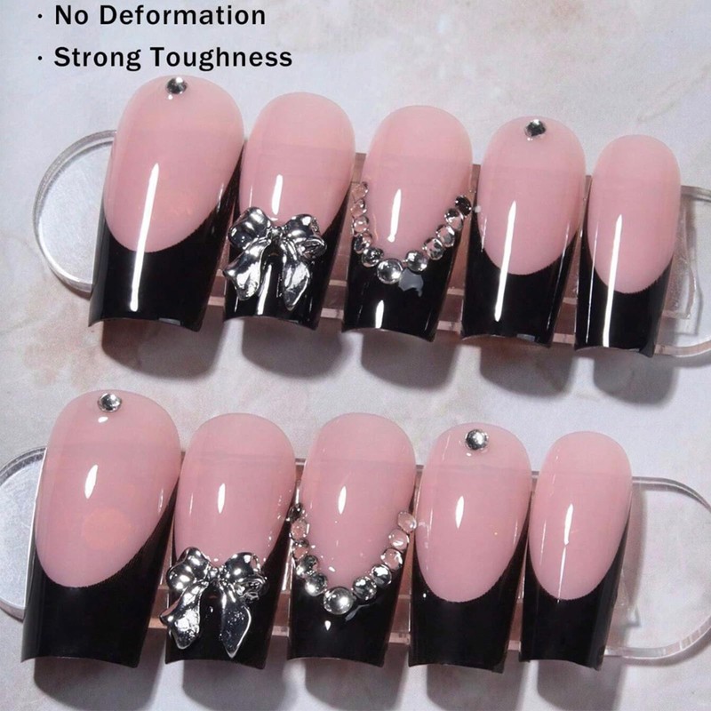 - Package Contents: Package with 24pcs friday medium length square black french tip press on nails with bow rhinestone charms design,24pcs jelly glue stickers,1pc nail file,1pc wooden stick.Difference sizes artificial nails can repeated use,you can trim it to any length you want,no need to buy other things,you can get acrylic press on nails