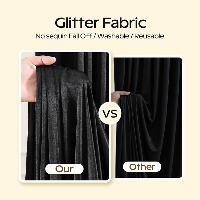 - Glitter & Soft & Durable Glitter Backdrop Curtain:Our black backdrop curtain unlike ordinary sequin backdrops,our glitter backdrop is soft,thick, durable and glitter that doesn’t shed.The backdrop curtain have two smooth polyester base combined with glitter that catches the light beautifully.Whether use it as a backdrop or a prop draped around a subject or a parties,it can creating a magical, high-end feel and adds a unique sparkle.
