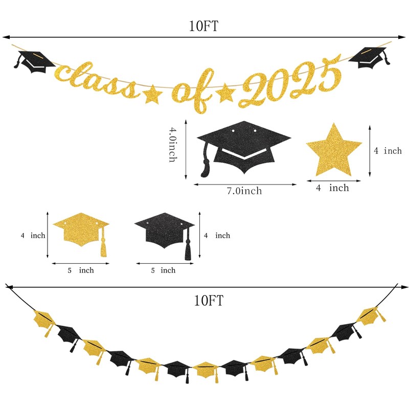 - 【Black Gold Graduation Decorations Kit Includes】This set has 6pcs gold black paper flower, 4pcs gold black fans,2pcs 8" gold black honeycomb, class of 2025 garland and graduation cap stream.