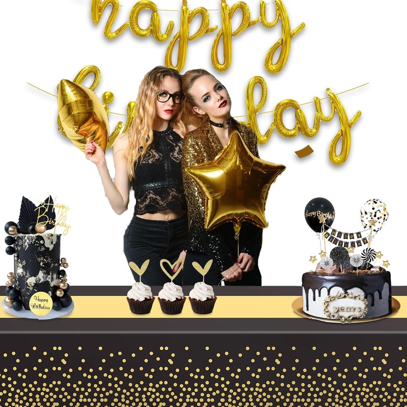 - The black gold birthday table cloth is made of good-quality PET, durable and water-proof disposable plastic.