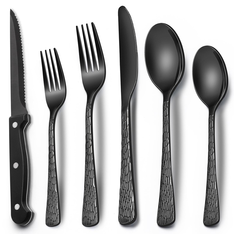 Black Hammered Silverware Set with Steak Knives, 24-Piece Stainless Steel Tree Pattern Flatware Set for 4, Food-Grade Tableware Cutlery Set, Utensil Sets for Home Restaurant, Mirror Finish