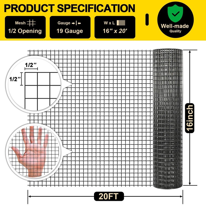 Black Hardware Cloth 16'' x 20' PVC Steel Vinyl Coated 1/2 inch Galvanized Wire Mesh Roll (19 GA) Chicken Wire Fence Roll, for coop Fences,Screen mesh, Rabbit/Snake Fences, Poultry enclosures, etc.