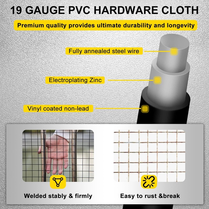 - 【Material Upgrade - Vinyl Coating】this time we have added PVC vinyl coating on the basis of the hardware cloth, wrapping it in the inner lining to Greatly improves the ability to prevent rust and corrosion, making durability even better The black color also greatly enhances the visual beauty. In comparison, our hardware cloth has a smoother coating technology and does not produce clumps,can buy with confidence.