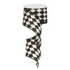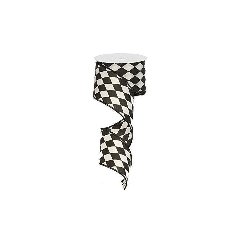 - Ten yard roll of black and white harlequin diamond check ribbon. 2.5 " wide.