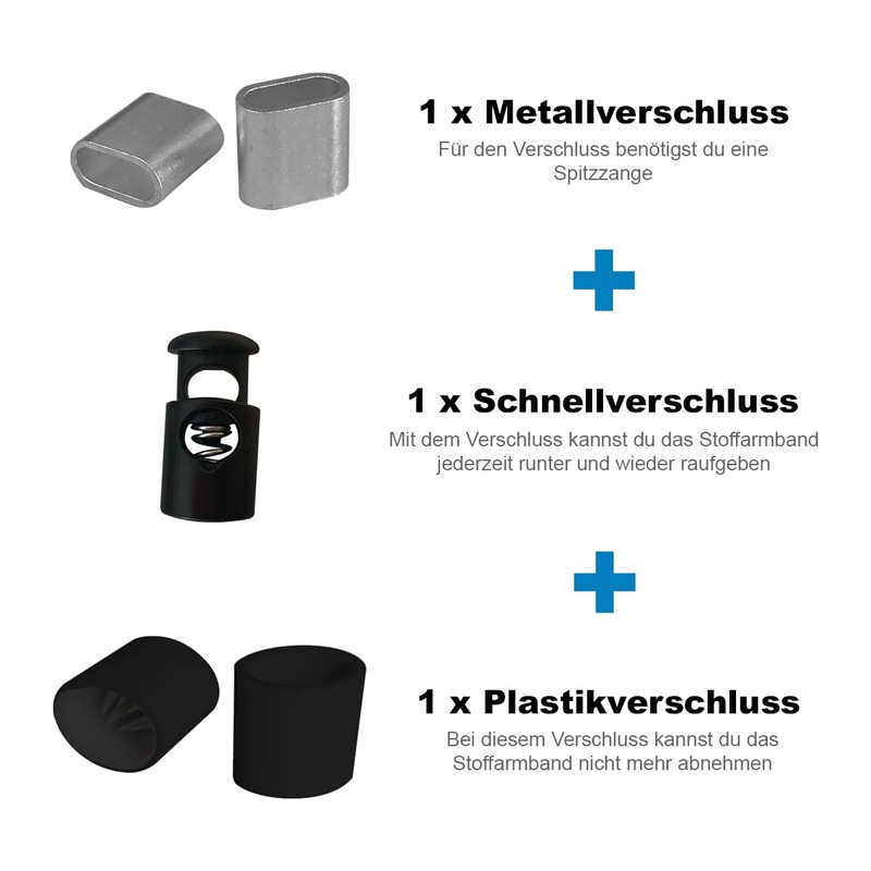 - 🔗 INDIVIDUELLER SCHNELLVERSCHLUSS: Dein Black is my colour Stoffarmband kommt mit drei verschiedenen Verschlüssen – Metall, Plastik und einem innovativen Schnellverschluss. Der Schnellverschluss ermöglicht ein müheloses An- und Ablegen, während die anderen Verschlüsse für eine sichere und dauerhafte Befestigung sorgen.