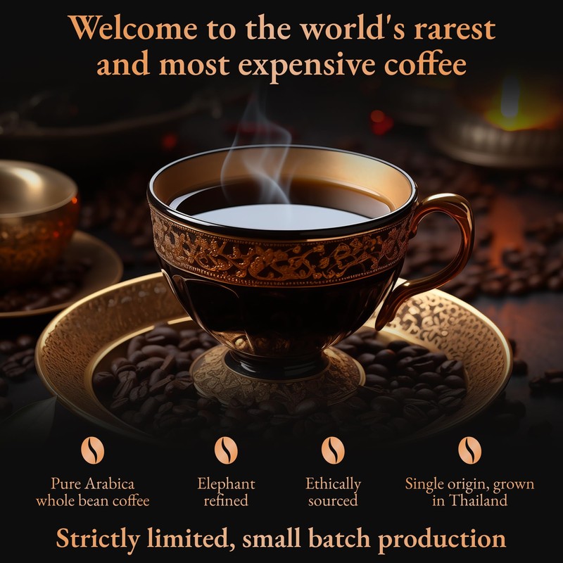 - The ultimate indulgence, in a cup! Treat yourself to the world's rarest and most expensive coffee. Refined by elephants for up to 72 hours, our Thai pure Arabica coffee beans are produced in strictly limited batches. Coveted by the world's most exclusive establishments, this unique, five-star coffee is now available for you to enjoy in your own home!
