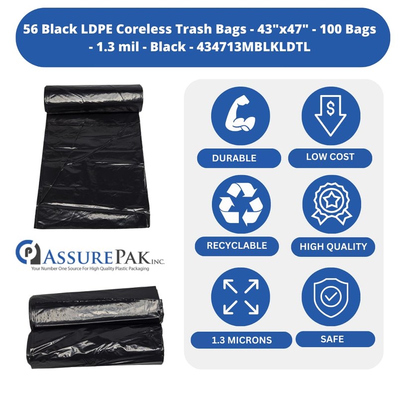 Black LDPE Coreless Trash Bags - 43"x47" - 100 Bags - 1.3 mil - Black - 434713MBLKLDTL - AssurePak