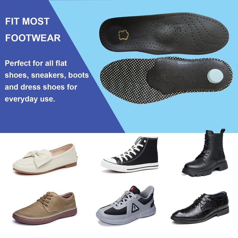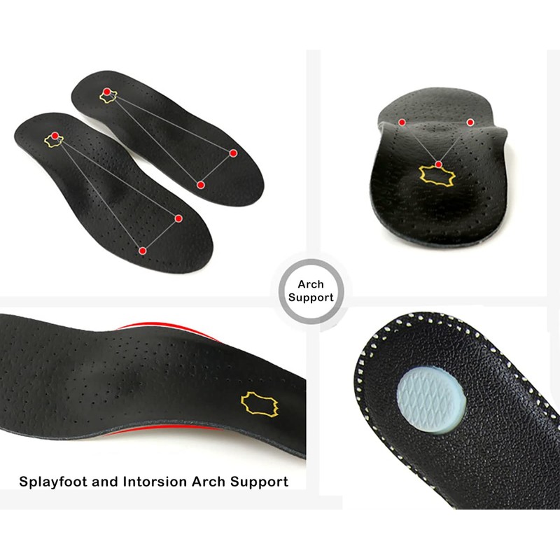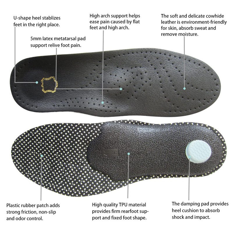 - Enhanced Arch Support -- The real cowhide insoles special designed with semi-rigid arch support for flat feet, plantar fasciitis and heel pain relief, provide additional arch support and maximum comfort cushion for whom suffering from foot problems, such as plantar fasciitis, heel pain, flat feet, metatarsal pain and other common foot pain. An ideal orthotic inserts for preventing and alleviating feet pain for adults.