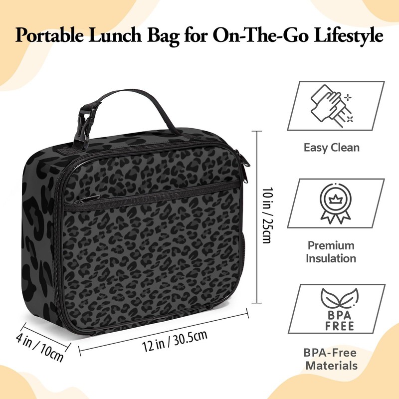 - Black Leopard Lunch Box: stylish and eco-friendly 300D polyester lunch box is the perfect accessory for your daily lunch routine. With its eye-catching and playful black leopard print, this lunch box is perfect for both kids and adults.