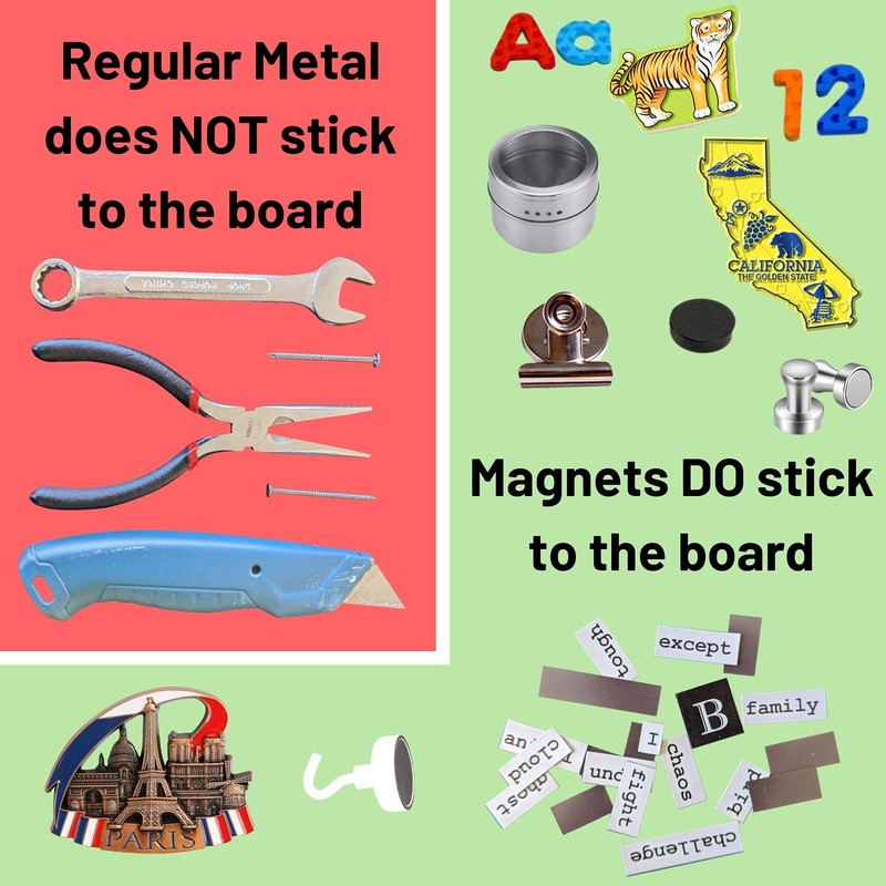 WARNING! Magnets stick to the board, but regular metal without a magnet will not.