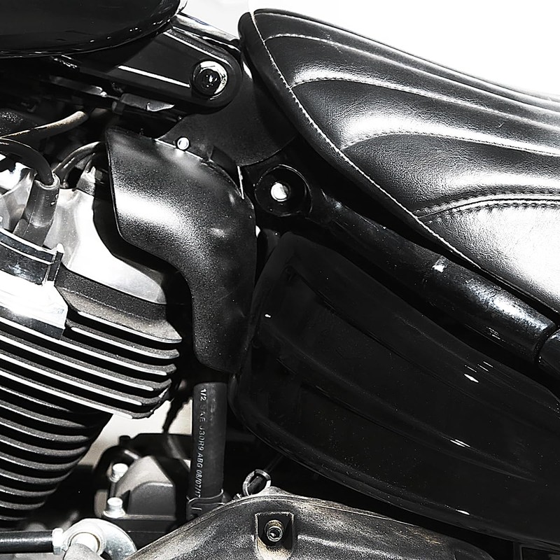 Inconspicuous black deflectors attach to the frame and surround the top of the rear cylinder head