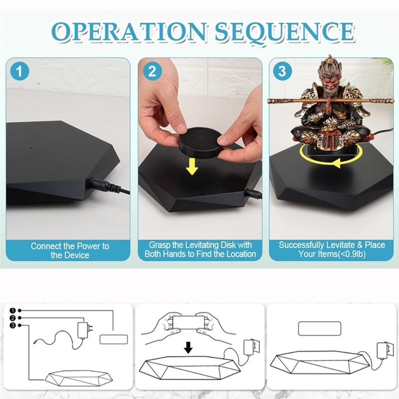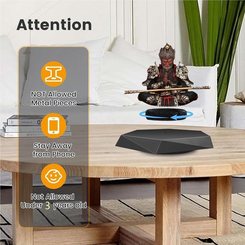 Magnetic Levitation Platform with Black Myth Model, Hold 400g Levitating Display Fashion Jewelry Floating Levitating Hand-Held Display Stand for Exhibition ShowFeatures:1. Levitating magnets can hold items weighing up to 400 grams in mid-air.2. This is a great magnetic levitation kit as an educational model science physics experiment toy.3. Objects continue to rotate in space! How amazing!4. Levitation is an attention grabber in all parties as it can levitate models, jewelry, memorabilia and collectibles.Specification:Power Adapter Input: AC 100-240VPower Adapter Output: 12V-2APedestal Size: 19 x 16 x 3cm / 7.5 x 6.3 x1.2 inchMax Load: 400g (0.9lb)Suspension Height: 0.8-1.5cm (0.3- 0.6inch)Diameter of The Magnet Tray: 6cm (2.4 inch)Certification: CE, RoHS ,UL ,FCCPackage Includes:1* Magnetic Levitation Display Stand With Black Myth Model1* Power Adapter1* Instruction ManualOPERATION SEQUENCE1. Place the base on a stable, level surface2. Plug in the power, hold the stand with both hands3. Aligned with the center point of the base and placed vertically downwards4. When there is a force to suspend the stand, slowly loosen the hands5. If the suspension fails, please try again and make sure the stand is aligned with the center point of the base and resuspendWARM TIPS FOR YOU1: Ensure the device is securely mounted on a flat surface, away from steel objects or electronics.2: Extend the Model's lifespan by removing it and disconnecting the power adapter before discontinuing device use.3: People with pacemakers should not touch thisdevice.4: Unsuitable for children under 3 years old.