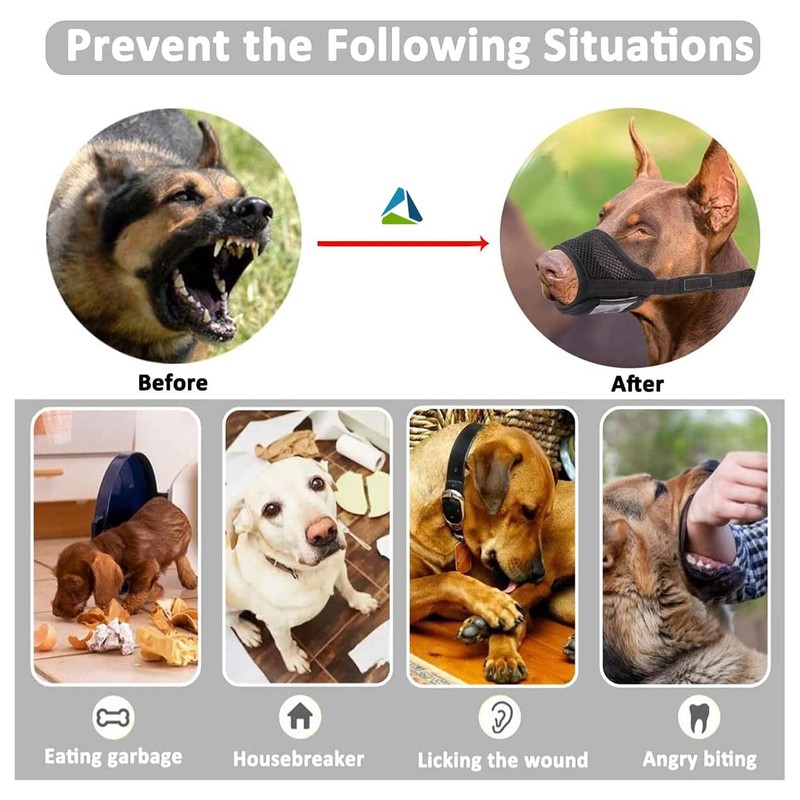 • 【Tips】1.This dog muzzle is NOT suitable for short-nose dogs, such as French Bulldog, Chihuahua, Shih Tzu, etc. 2.Before wearing it for the first time, your dog will usually feel uncomfortable. You have to comfort the dog, don't force it. Do not leave the dog unattended with a dog collar for a long time.3.Please measure your dog's size before purchasing.