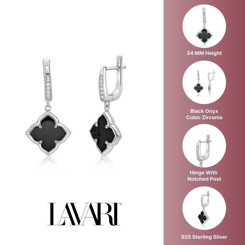 Black Onyx Four Petal Flower Dangle Earrings for Women with Cubic Zirconia in 925 Sterling Silver by Lavari Jewelers