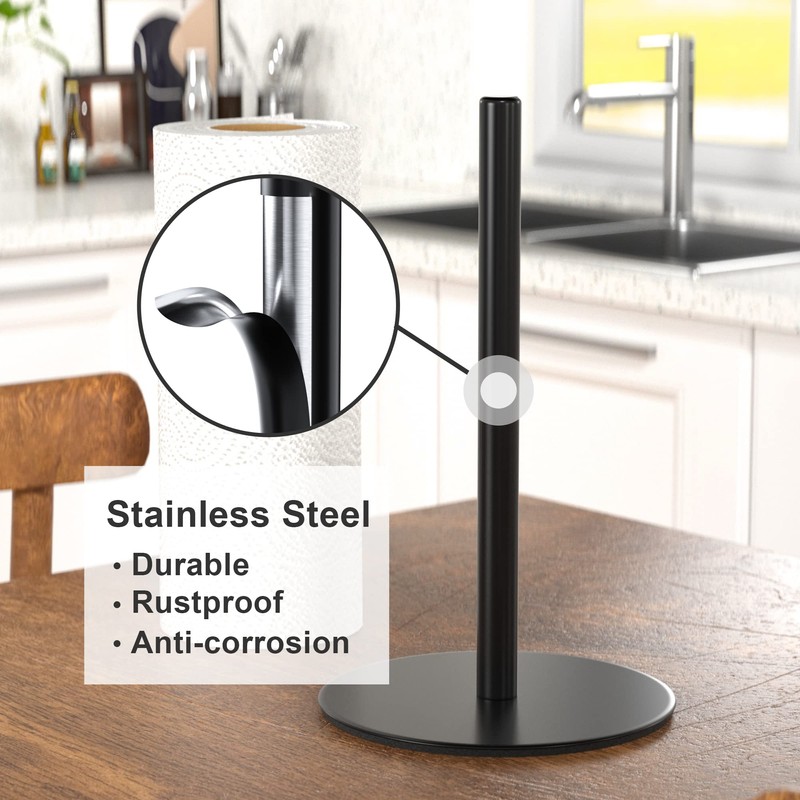 - Material - The paper towel holder is made of premium stainless steel, with non-slip base and matte black finish, rustproof and waterproof,suit for every style kitchen environment.