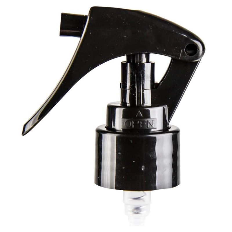 Elevate you're misting and spraying needs with this sleek and modern 4 oz black PET plastic round bottle. Featuring a mini trigger sprayer with a locking button to prevent accidental discharge, this light weight bottle offers a tall and stylish appearance. Perfect for essential oils, fragrances, misters, and more. PET material insures durability and ease of use. Effortlessley dispense and refill your desired liquids with precision and control, while adding a touch of sophistication to your space. Excellent for travel.