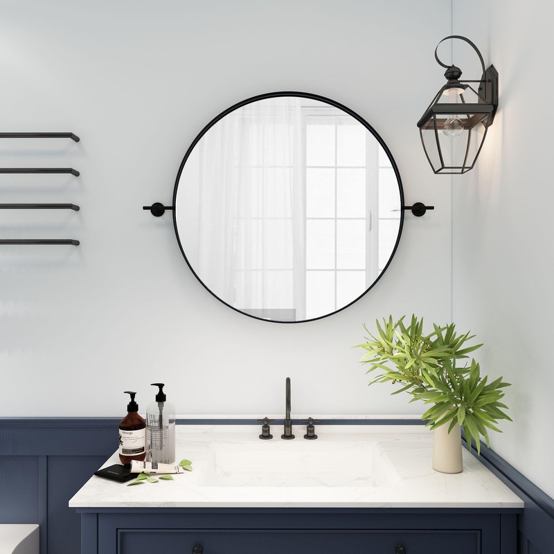 Black Pivot Round Mirror 24 Inch Circle Metal Framed Farmhouse Bathroom Mirror Tilting Beveled Vanity Mirrors for Wall