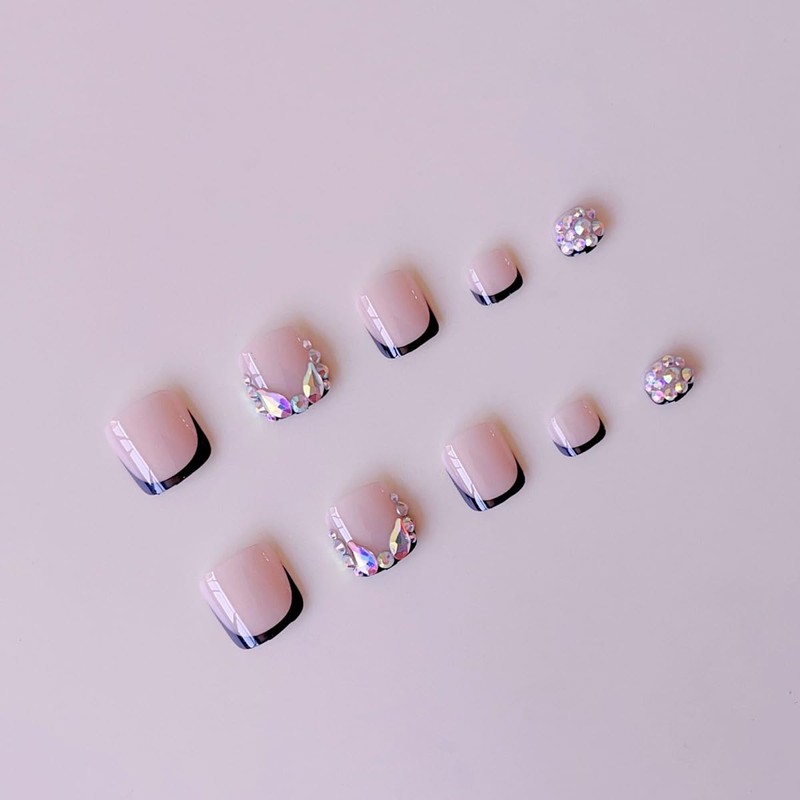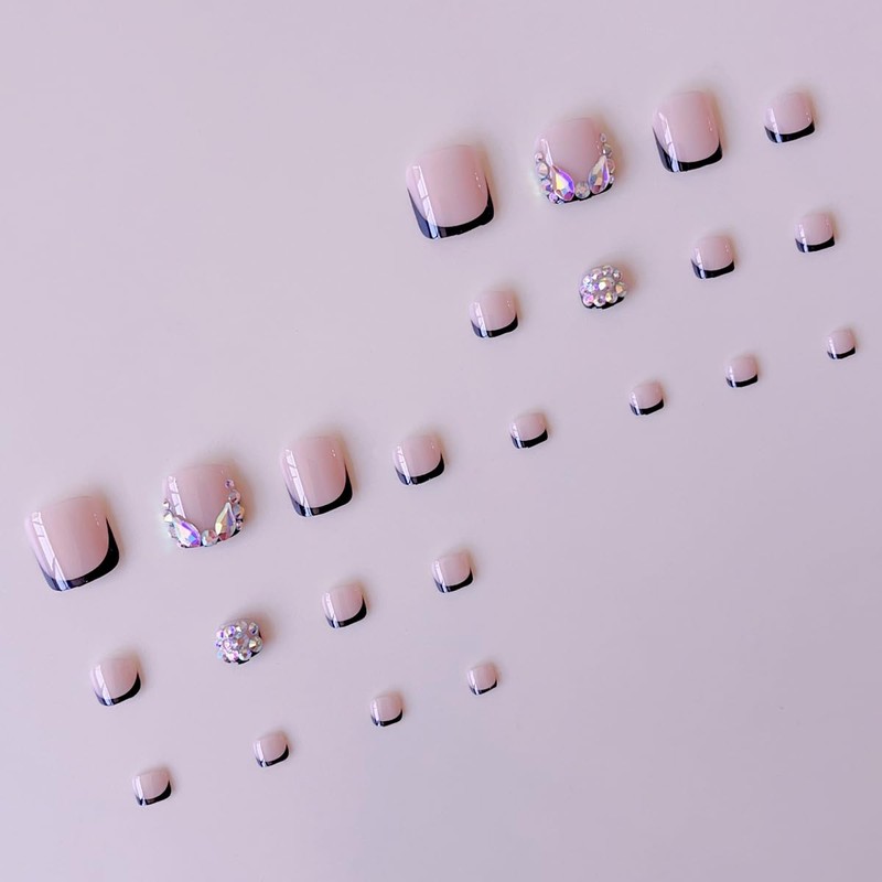 - Suggestion:Diamond french tip false toenail.You can use the toenail glue sticker we gave you.However, nail glue stickers are not as good as liquid nail glue.However it makes fake nails reusable.If you want the nails to last longer,you can use liquid nail glue for a lasting effect of 1-2 weeks