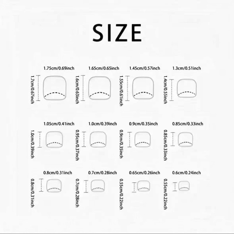 - Package Includes:Summer beach fake toenails.You will get 24 pieces of short square press on toenails in 12 size,a piece of adhesive tabs nail file and a small wooden stick,for easily matching each toe nail whatever your nail size is.Flexible and super comfortable as your own nails