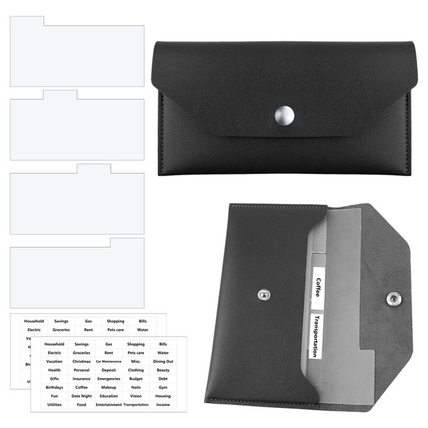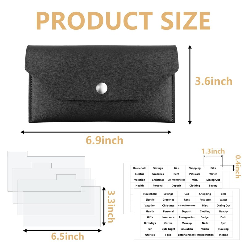 Black PU Leather Cash Wallet with 4 Cash Dividers and 2 Envelope Tab Stickers for Budget Planner