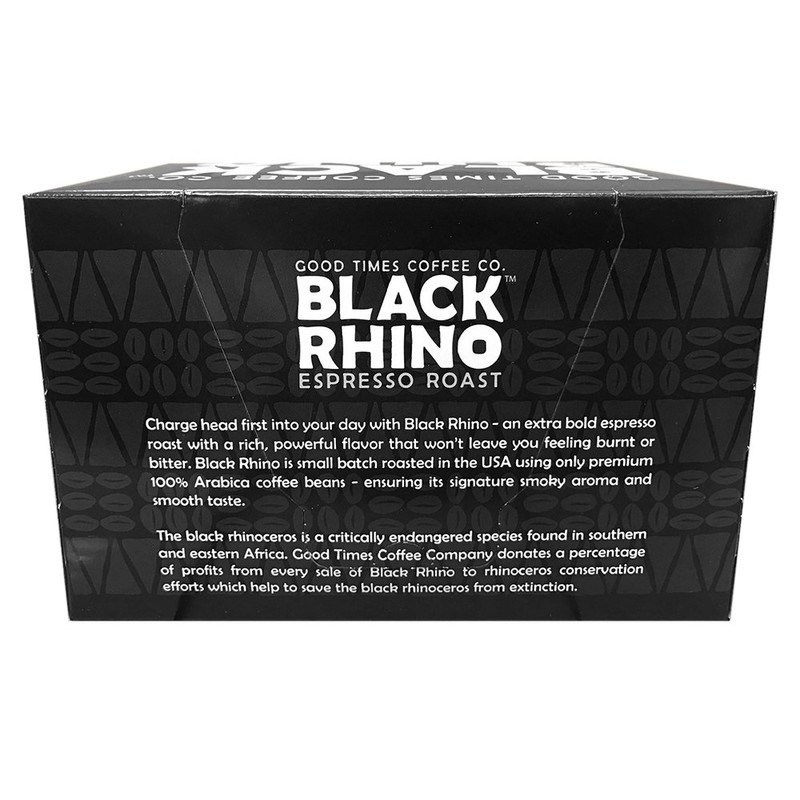 - Your purchase helps save a rhinoceros - Good Times Coffee Company donates a percentage of profits from Black Rhino to rhinoceros conservation efforts which help to save the black rhinoceros from extinction