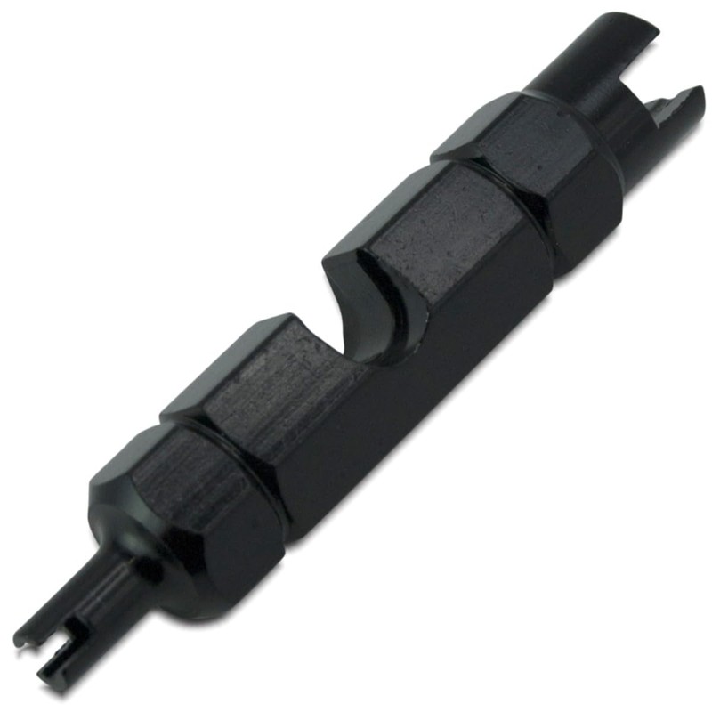 Double key for car valve inserts AV and road bike valve inserts SV and also suitable for valve extensions for greater leverage in the middle.
