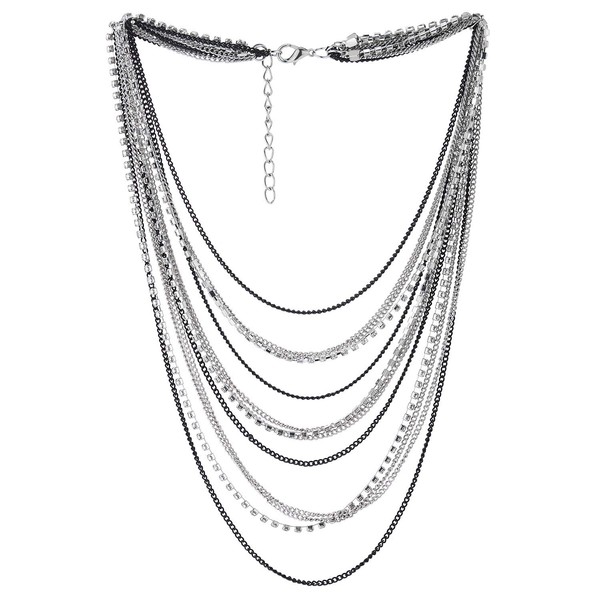 Black Silver Waterfall Multi-Strand Chains Statement Collar Necklace with Rhinestones Chains, Dress(CA)