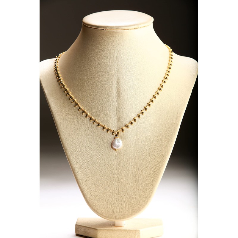 Black Spinel Micro Faceted Diamond Cut Gold Beaded Necklace with Fresh Water Coin Pearl and Rhinestone Spacer Extendable Chain. Available in : 14", 16", 18" , 20", 22" 24", 26" and 28" plus 2" Extension (Picture shown 16" + 2" Extension)