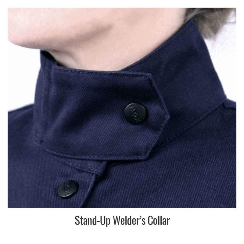 - Stand-up welders collar helps protect neck