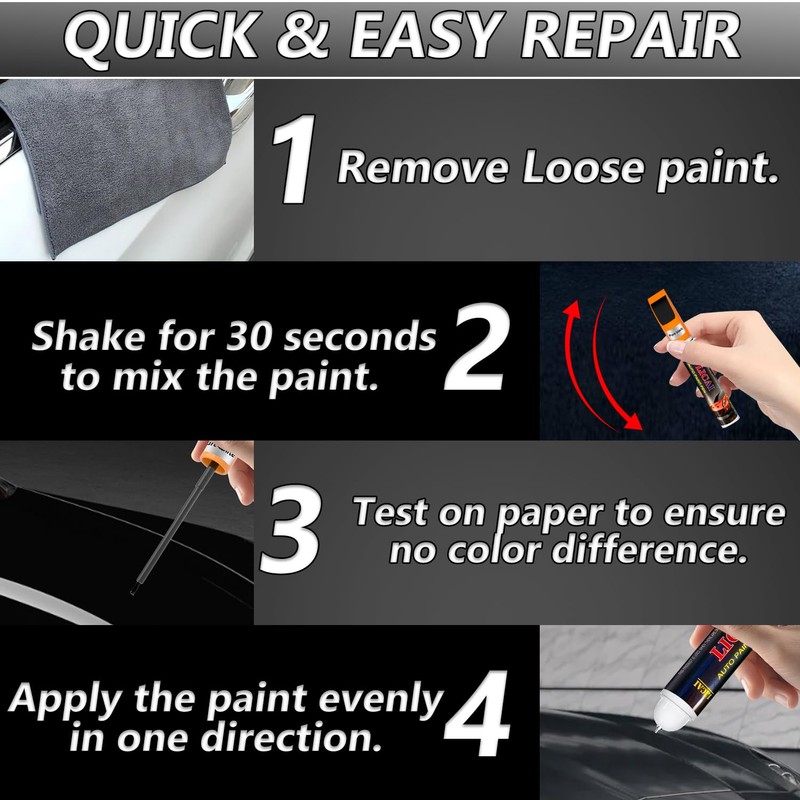 - Quick & easy paint repair - Our car paint touch up pen is easy to apply and usually dries fast. Just clean the scratched area and remove loose paint, shake the white paint pen for about 1 minutes to mix well. Then, test it on paper to ensure no color difference. Last, apply the paint evenly in one direction to cover the scratches. Our car scratch remover is a great helper and money-saver for your repairs.