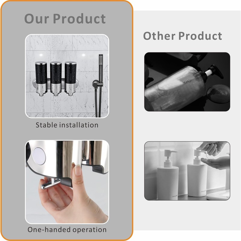 - Stylish Design: With its modern appearance and advanced coating technology, this matte black bathroom shower dispenser is easy to clean and suitable for many environments, including bathrooms, kitchens, schools, hospitals, hotels, and restaurants