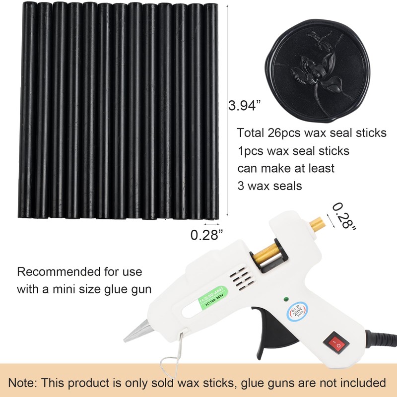 - Easy to Use: Our sealing wax sticks features 0.28 x 3.94 inch, making them compatible with 0.28" glue gun for easy melting. 26pcs glue gun sealing wax sticks available for 100-130pcs standard wax seal stamp seals. Whether you're a beginner or an experienced artist, you can effortlessly create exquisite wax seal designs