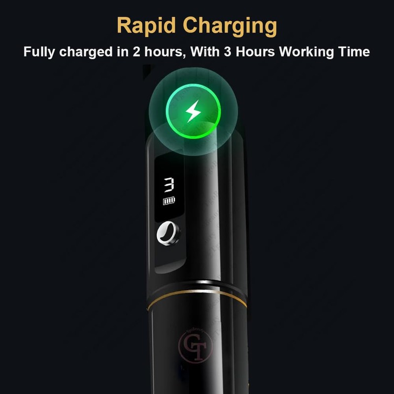 - LED Display Screen: The machine is with LED display screen, displaying the speed and power level of the battery, allowing the tattoo artists to better control and charge it in a timely manner.