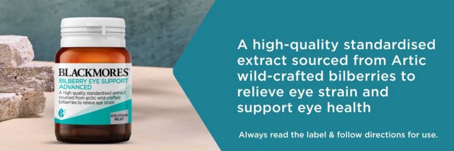 Support your eye health with Blackmores Bilberry Eye Support Advanced tablets. This formula is a high-quality standardised extract sourced from Arctic wild bilberries to help relieve eye strain and support eye health. It is an antioxidant to reduce free radicals in the body while it supports blood vessel health, eye health and general health and wellbeing. Adults: Take one tablet per day to help give your eyes much-needed relief.