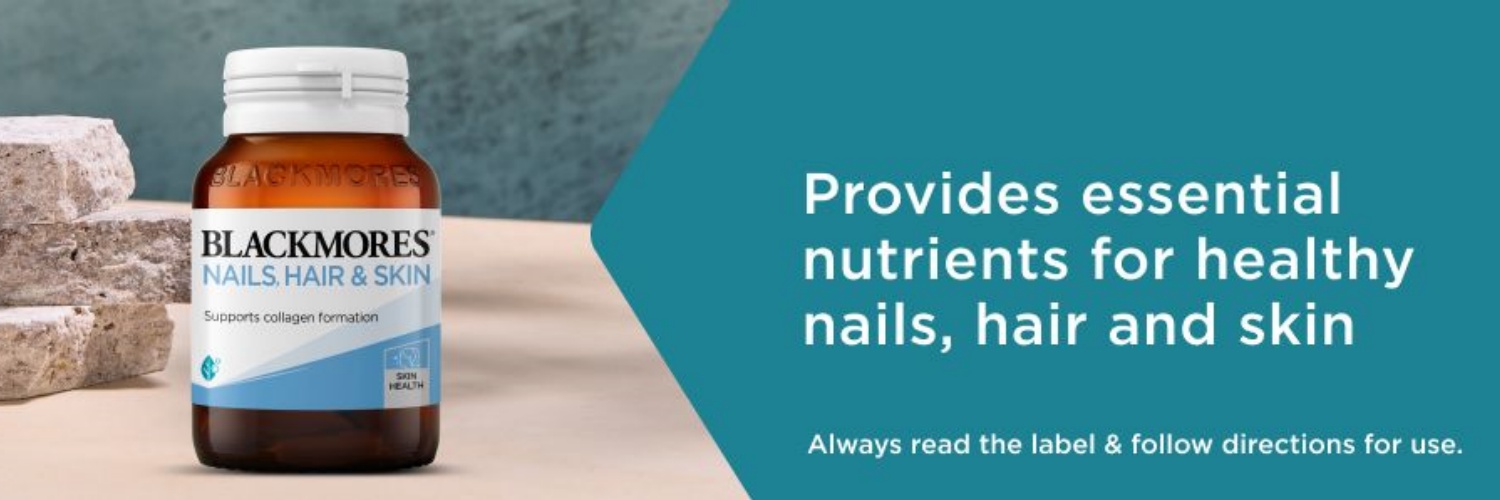 Blackmores Nails, Hair & Skin provides essential nutrients for healthy nails, hair, and skin.