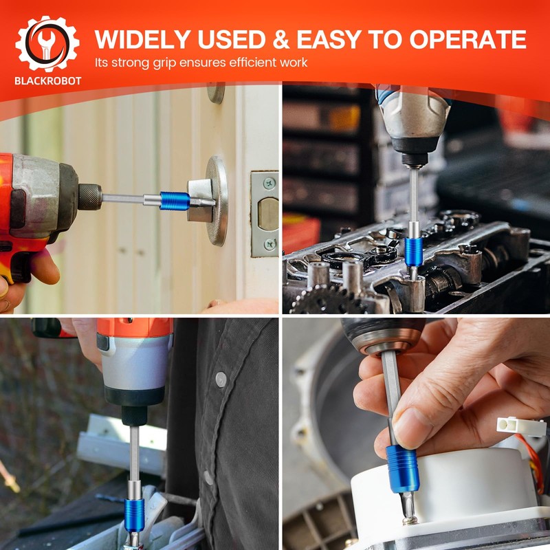 • WIDE APPLICATION: The BLACKROBOT 1/4 bit holder set is essential for various hexagonal tools. Compatible with 1/4-inch products, our screwdriver bit holder is perfect for installing, loosening, or removing tasks with pneumatic, electric, and manual screwdrivers, drills, and impact drills. Ideal for DIY projects, home maintenance, and repairs—including motorcycle, bicycle, and carpentry—this versatile tool is a must-have for professionals and hobbyists
