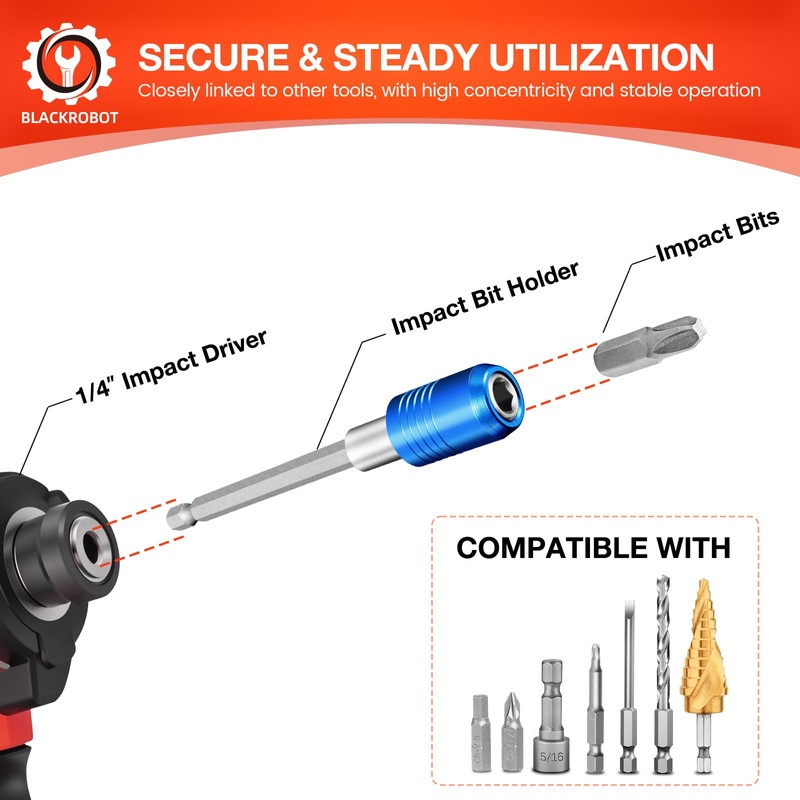 • AUTO - LOCKING DESIGN: The locking bit holder features an auto-locking mechanism for quick, secure bit changes, protecting your fingers and ensuring hassle-free use. Its extended torsion zone absorbs torque peaks, reducing stress on the bit tip for improved durability. With a precise fit that minimizes wobbling and maintains excellent concentricity even at high speeds, our BLACKROBOT bit holder for impact driver is perfect for achieving smooth, professional results in heavy-duty tasks